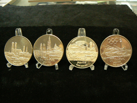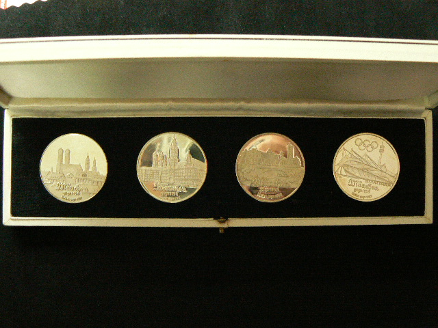 München: 4 Silbermedaillen 'München' / Stadtansicht/Rathaus/Deutsches Museum/Olympia-Zeltdach